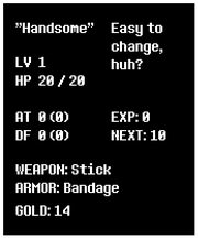 If the game detects that the name has been edited (for example, if it is longer than six characters), the text "Easy to change, huh?" appears in the Stats menu. Oddly enough, this does not occur if a forbidden name is used.